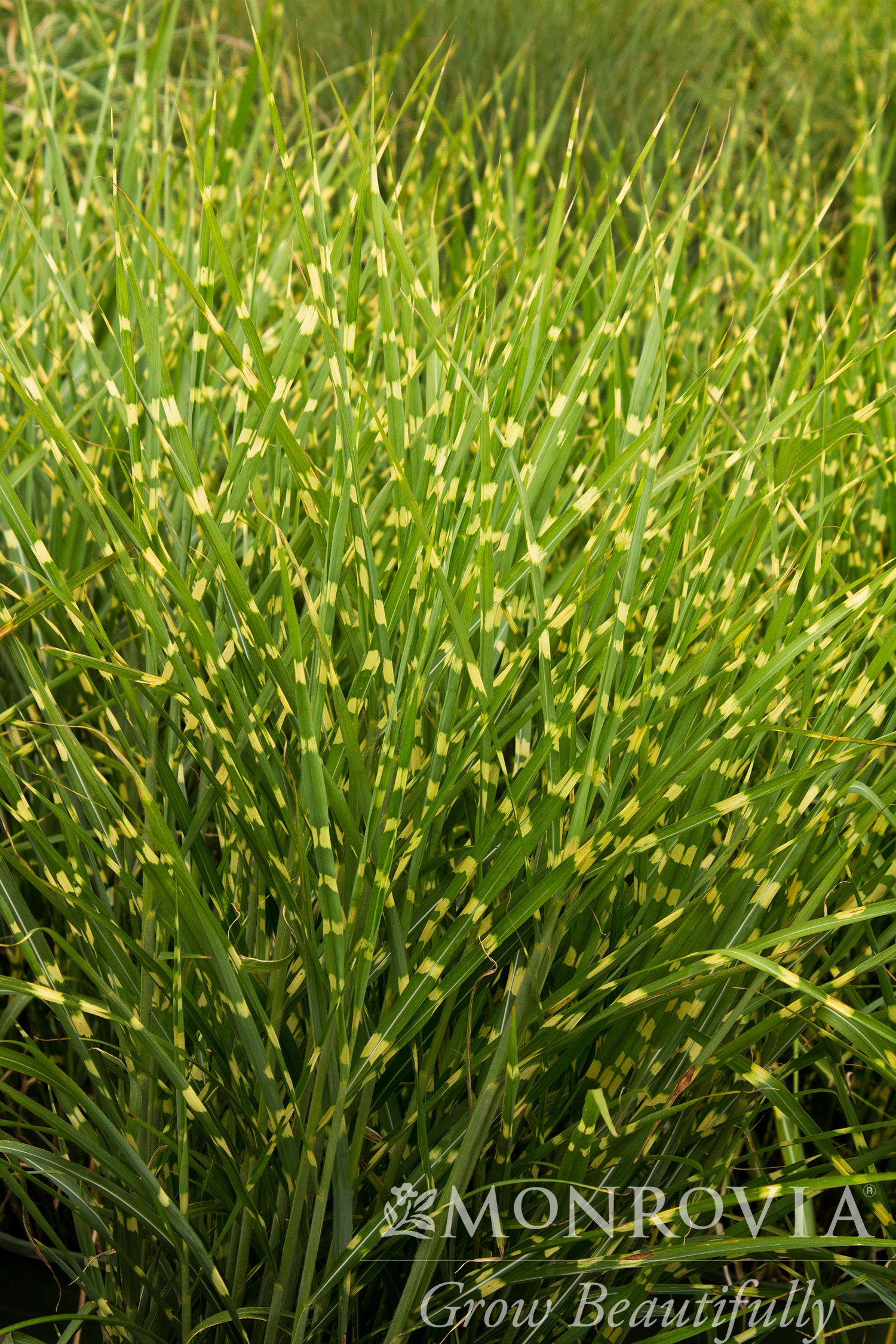 Beautifully variegated blades feature creamy yellow-white bands, and hold their sturdy, upright form all season. In early fall, tall pinkish flower spikes rise above the foliage, and fade to tan through winter.
